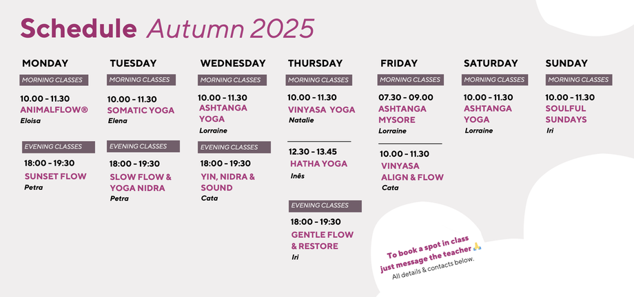 YIN, NIDRA & SOUND with Cata (Wednesdays 18:00) Like slipping into calm waters, this practice invites you to slow down, surrender, and journey inward. Rooted in the wisdom of Traditional Chinese Medicine, Yin Yoga works with Qi, the vital energy, through the meridian system framework. Soft, intentional movements awaken and nourish the fascia — the body’s vast, three-dimensional energetic network — helping energy flow and tensions release. Yoga Nidra and sound carry you into a state of conscious rest and meditative depth. Part of the class will have the presence of live sound and voice creating a living tapestry of vibration that invites surrender and presence.