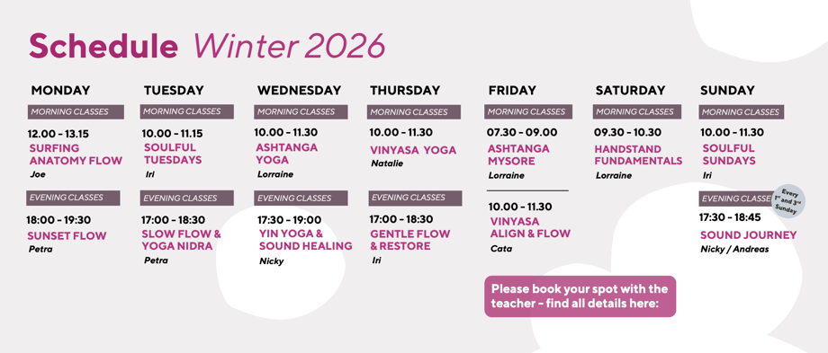 YIN YOGA & SOUND HEALING with Nicky (Wednesdays 17:30). A gentle, meditative class that invites you to slow down and reconnect with your body and breath through Yin Yoga - long-held, passive stretches on the floor to release deep tensions in muscles, joints and the fascia . Perfect after a day of surfing or whenever you need a full-body rest. At the end of the class, you’ll be immersed in the vibrations of crystal singing bowls, creating a soundscape that calms the nervous system and enhances the inner journey. No experience needed - just come as you are.